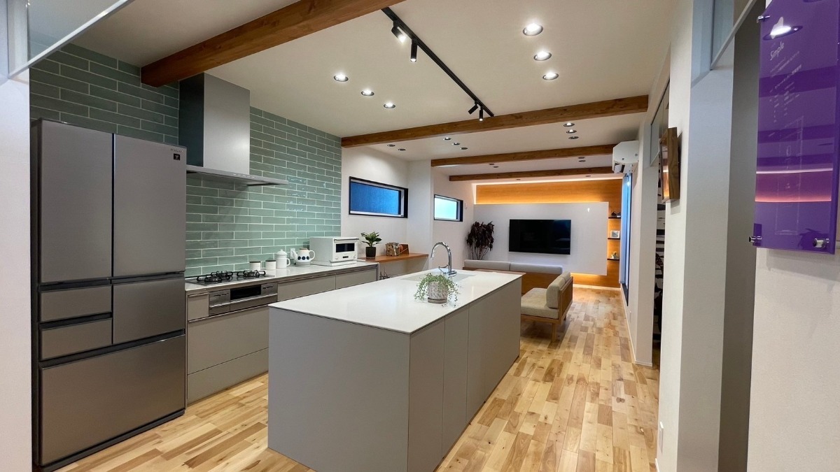 中央に設けられたキッチンが目を引くオシャレなリビング。