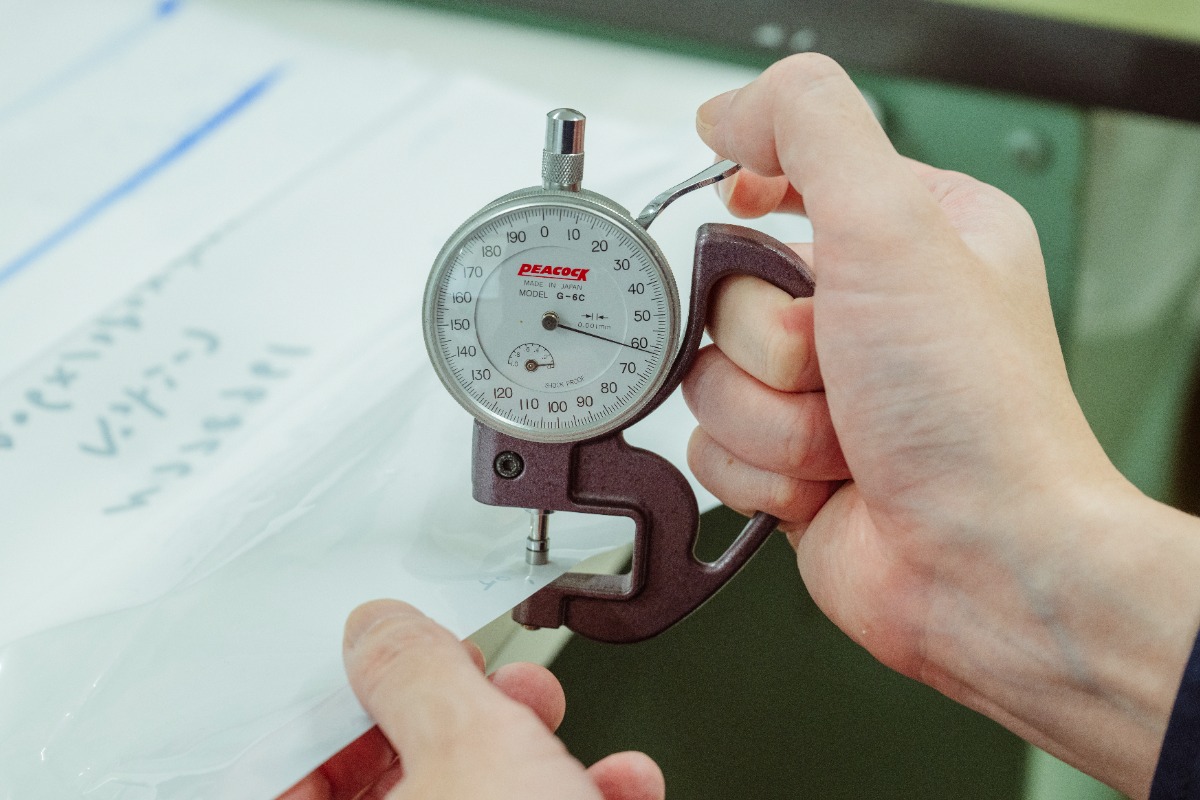 フィルムの厚みを測定するダイヤルゲージです。製品の厚みが規定通りか確認するのに欠かせない道具ですね。
