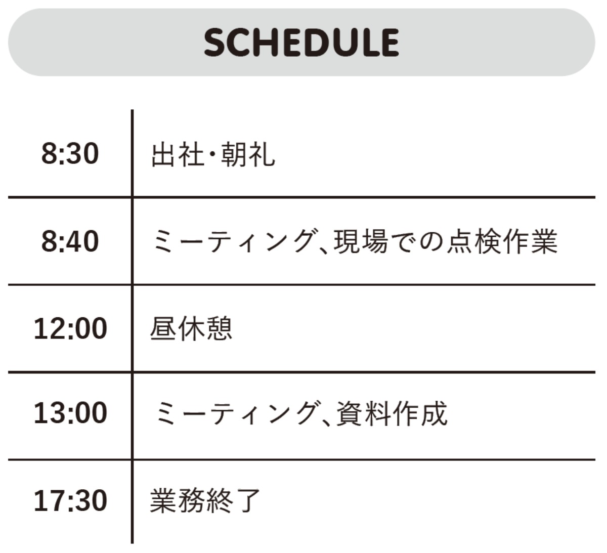 2012年に起きた笹子トンネル天井板落下事故で世間にも知られるようになったが、このような点検は極めて重要な仕事だ。ただ、近接目視や打音検査など高所で行う危険な作業も少なくない。そのため、情報収集をして作業の段取りを考え、現場で安全に作業できるよう万全の事前準備を行うことが大切だ。そこで必要になるのが「聞く力」。点検スタッフや発注者など作業に関わる全員の意見や要望をまとめるのに、コミュニケーション能力は欠かせないという。