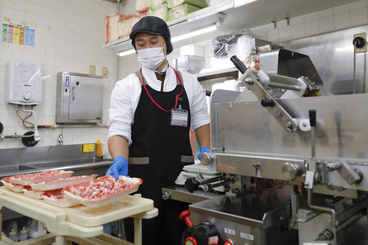 入社から3年目の現在に至るまで、「フジグラン重信」の畜産部門一筋をつらぬく樋渡さん。鶏や豚、牛など各種食肉の調理加工や商品陳列が主業務だが、最初は肉の種類も区別がつかないところからのスタートだったそう。「今ではすっかり目利きもできるようになりました。初心を忘れず、商品が自分の手から直接お客さまに届いている責任感を持ちつつ、加工業務に取り組んでいます」と謙虚に語る。