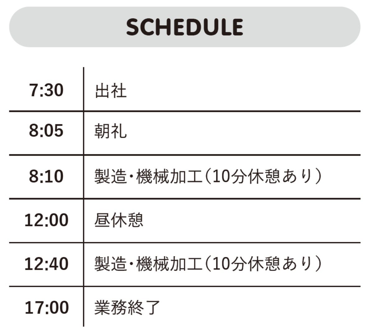 ※年間休日113日、年末年始、お盆、GW、地方祭、有給休暇(10~20日)