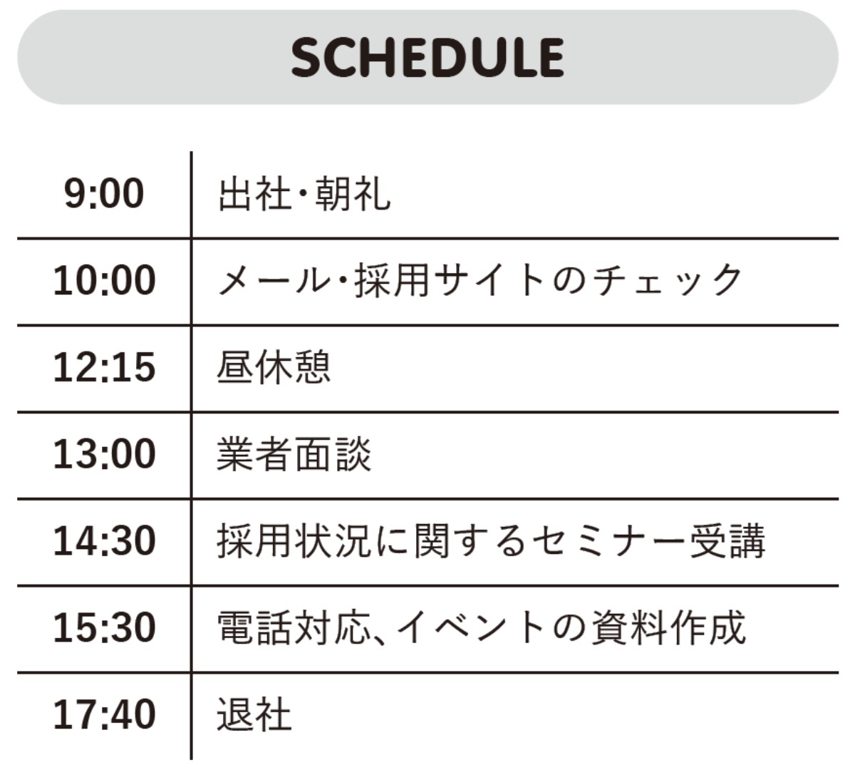 現在は、オープンカンパニーや仕事体験の企画をしたり、採用セミナーを受講し情報収集したりしていて、今後は企業説明会も担当していくそう。上司を頼りながらではあるが、就活生の気持ちを理解できることが自身の強み。