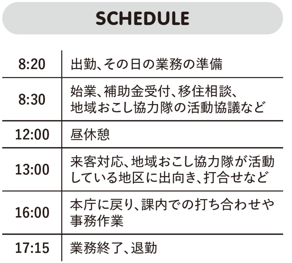 観光・産業振興、福祉充実など多彩な業務がある一方、近年では移住者に手厚い支援を行っている。
