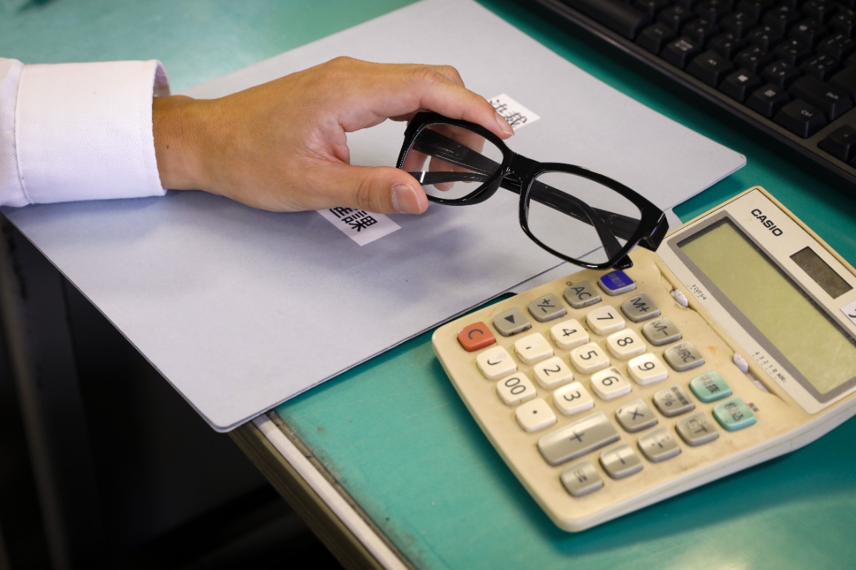 業務上、事務作業も多い。金融機関に勤務していたときから、ずっと愛用している電卓と眼鏡は必須アイテム。