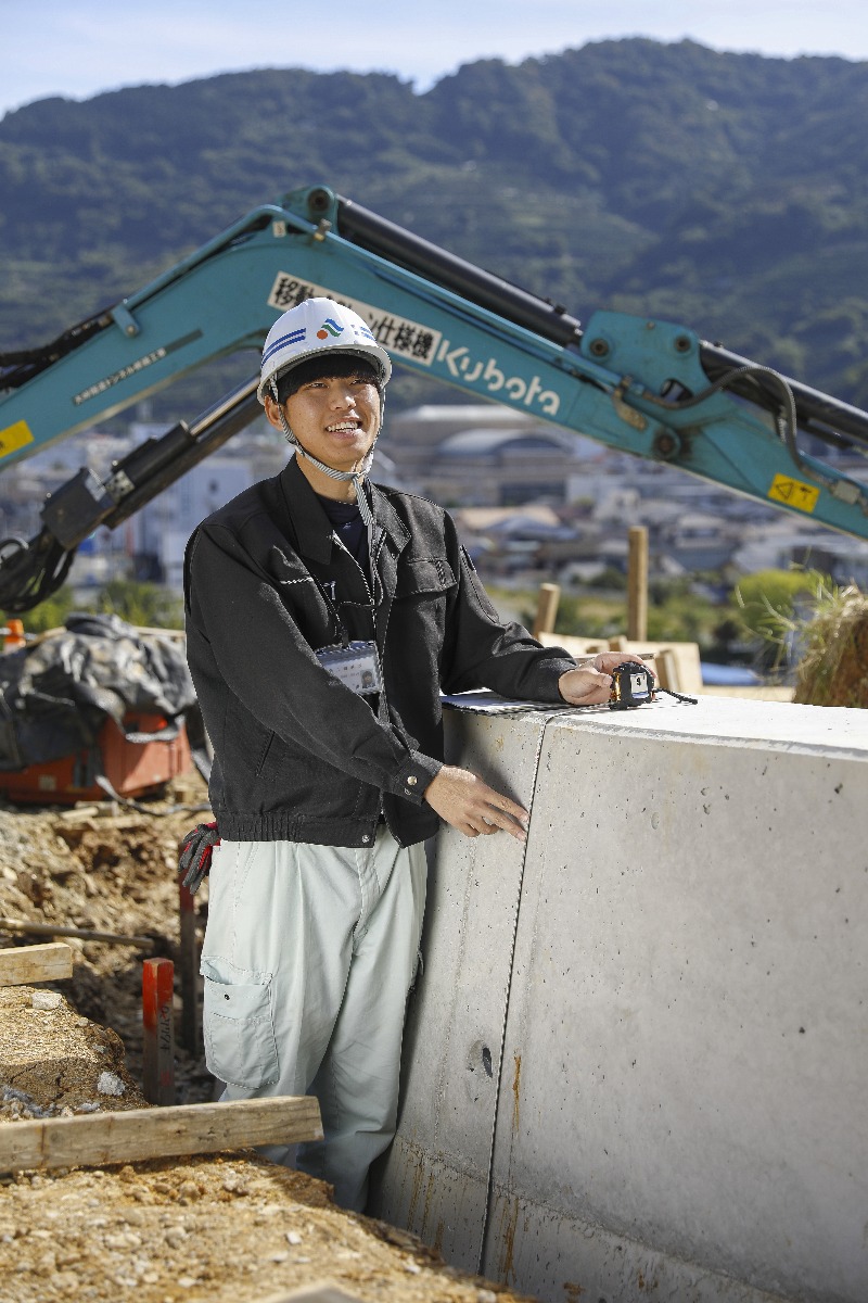 西予市出身。幼い頃から土木関係で働く父親の姿を見て育ち、宇和高校から日本文理大学工学部建築学科へ。卒業後、大好きな地元で土木の仕事に就く夢を実現。