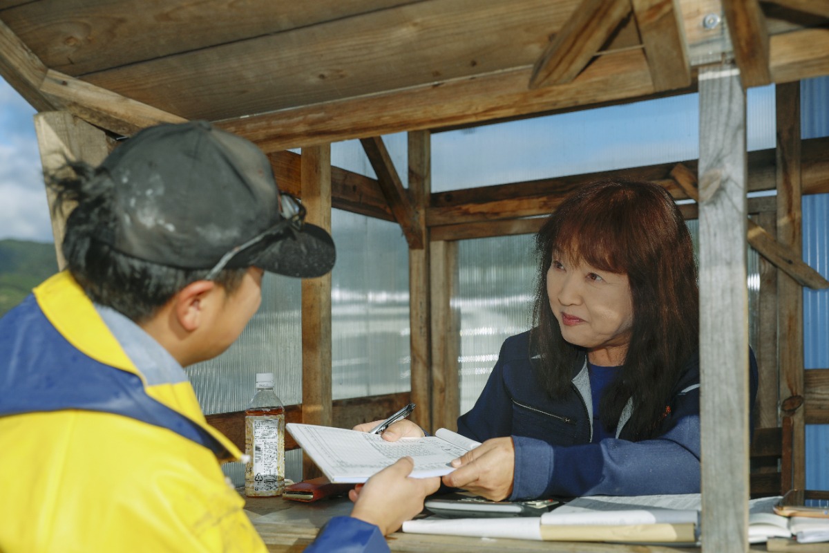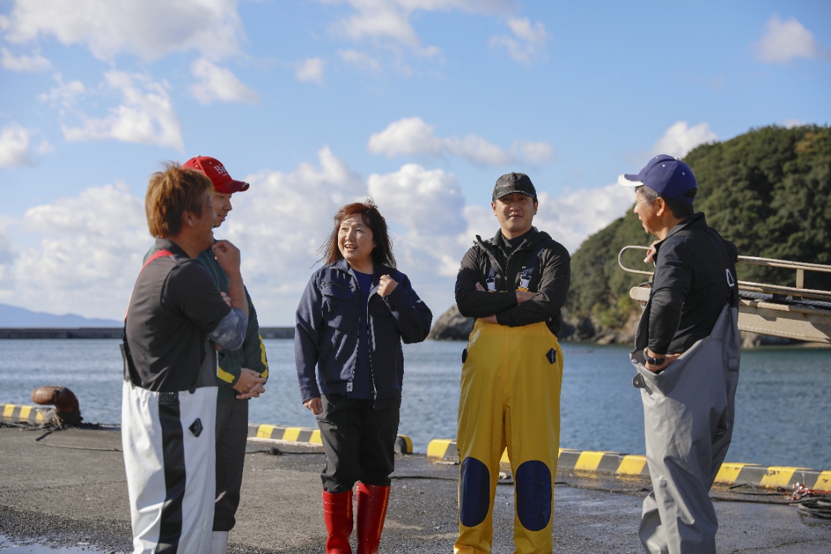 早朝、マダイの出荷作業で活気づく港に、陣頭指揮をとる楠さんの姿があった。生簀から水揚げされたマダイは、彼女の声掛けのもと迅速に活魚車へ収められていく。