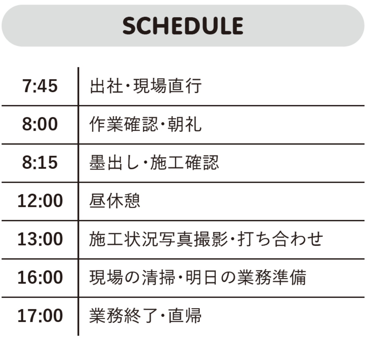 現場は墨出しや測量など助け合う作業が多く、活気に満ち、多様な意見が飛び交うので知識向上にも繋がります!