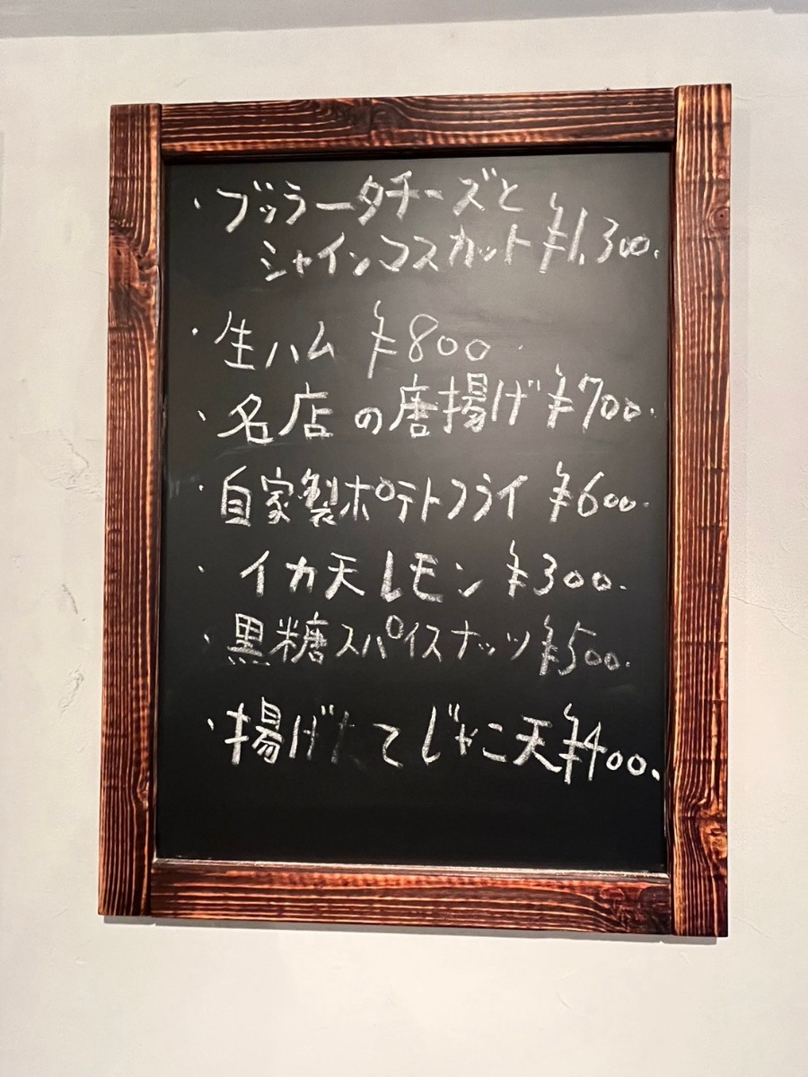 他にも、爽やかなレモンがアクセントのイカ天(300円)や、濃厚な旨味が自慢の生ハム(800円)、さらに愛媛の名店から取り寄せた唐揚げ(700円)など、どれもレモンサワーやワインと相性抜群のものばかり。