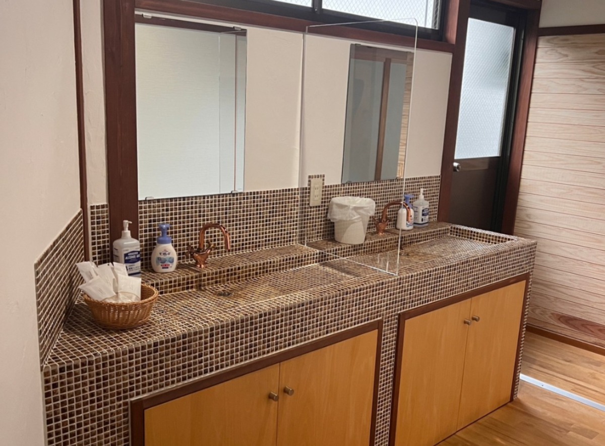 レトロなタイルや蛇口を備えた風情ある佇まいの洗面台。