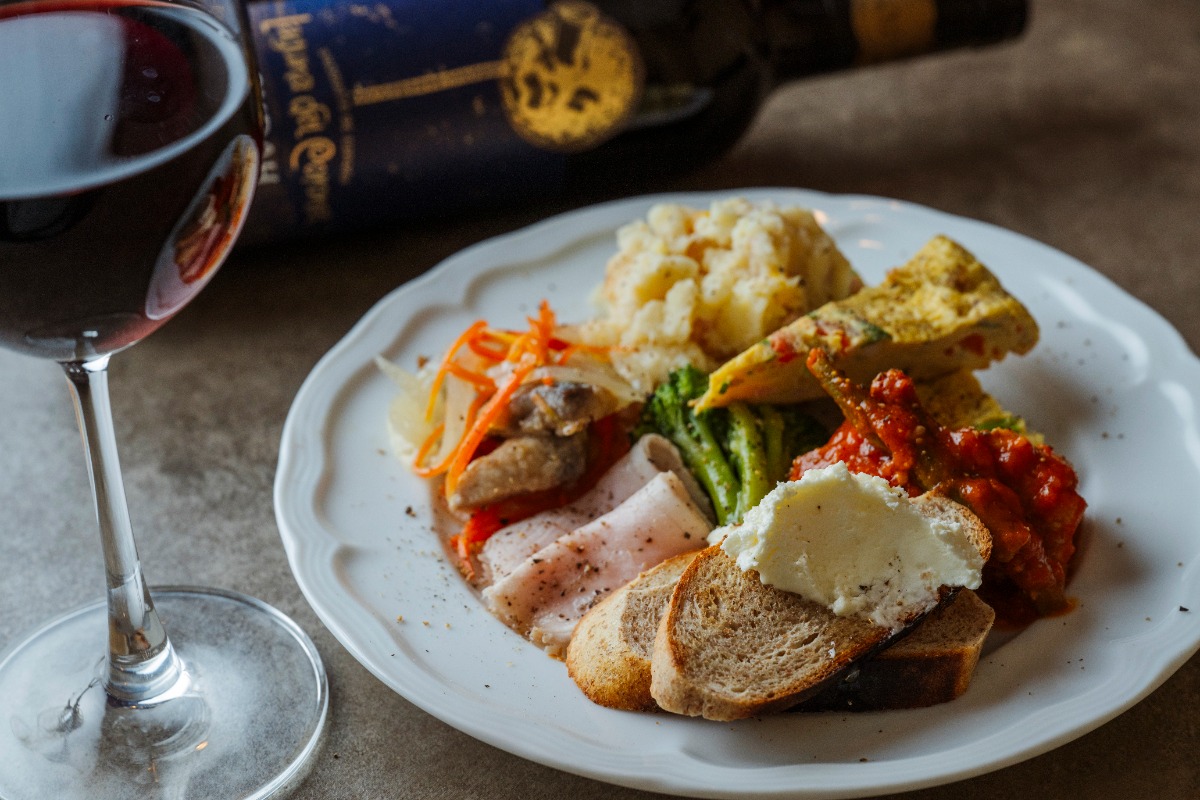 ブロッコリーのアンチョビ、エスカベッシュ、生ハムなどイタリアで親しまれている食材がふんだんに詰まった盛り合わせ。