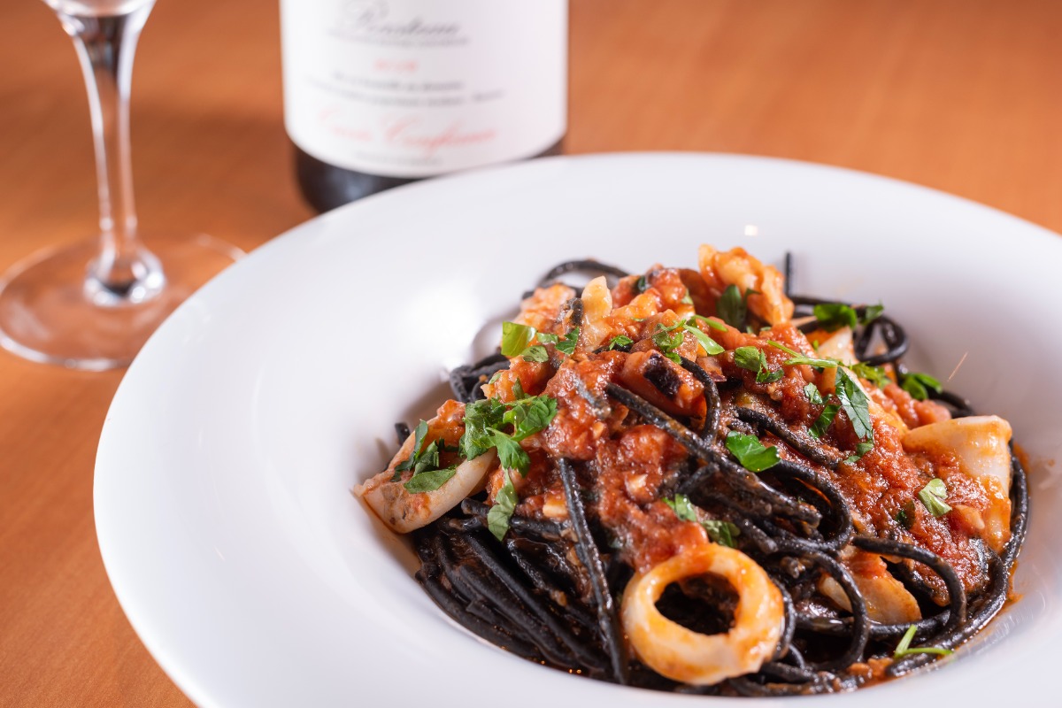 人気メニューの「イカスミのスパゲッティ魚介のトマトソース」は、宇和海で採れたコウイカをはじめ、エビ・タコ・アサリといった地元の海の幸と自家製ソースが絶妙に絡み、リピーターが多いです。