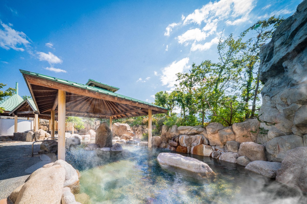 西日本最大級の野天風呂を誇る「利楽」と、併設の宿泊施設「樹楽」。