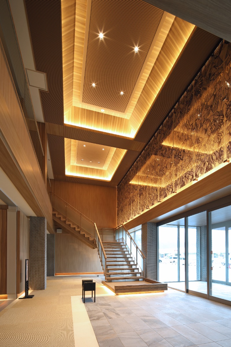 エントランスは開放感あふれる吹き抜けで、太古から息づくシダがモチーフの壁面。