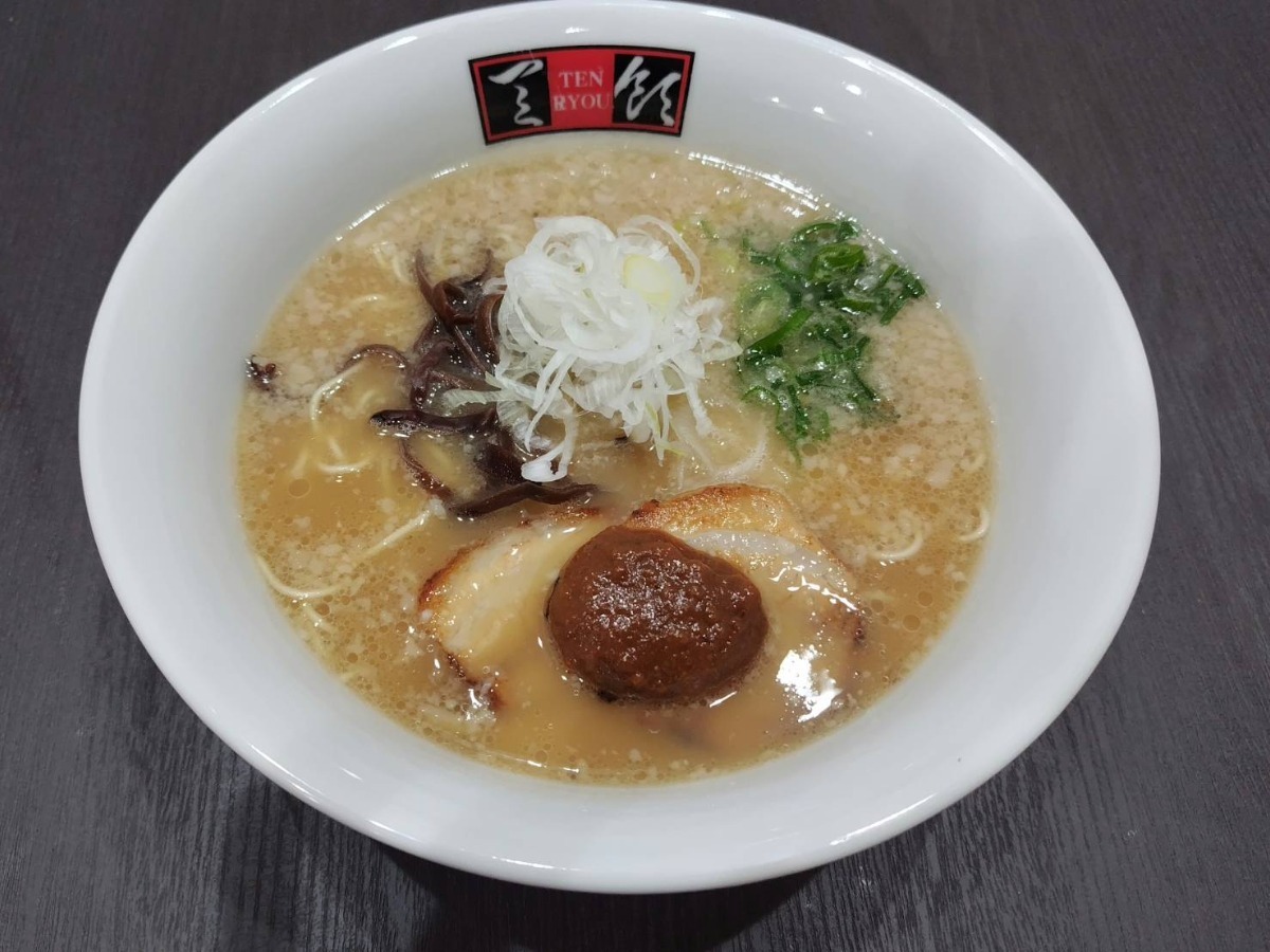 「天領 二番町店」で最も人気の高い「元味ラーメン」(880円)は、豚骨醤油スープとストレートの細麺の黄金コンビが魅力の一品です。