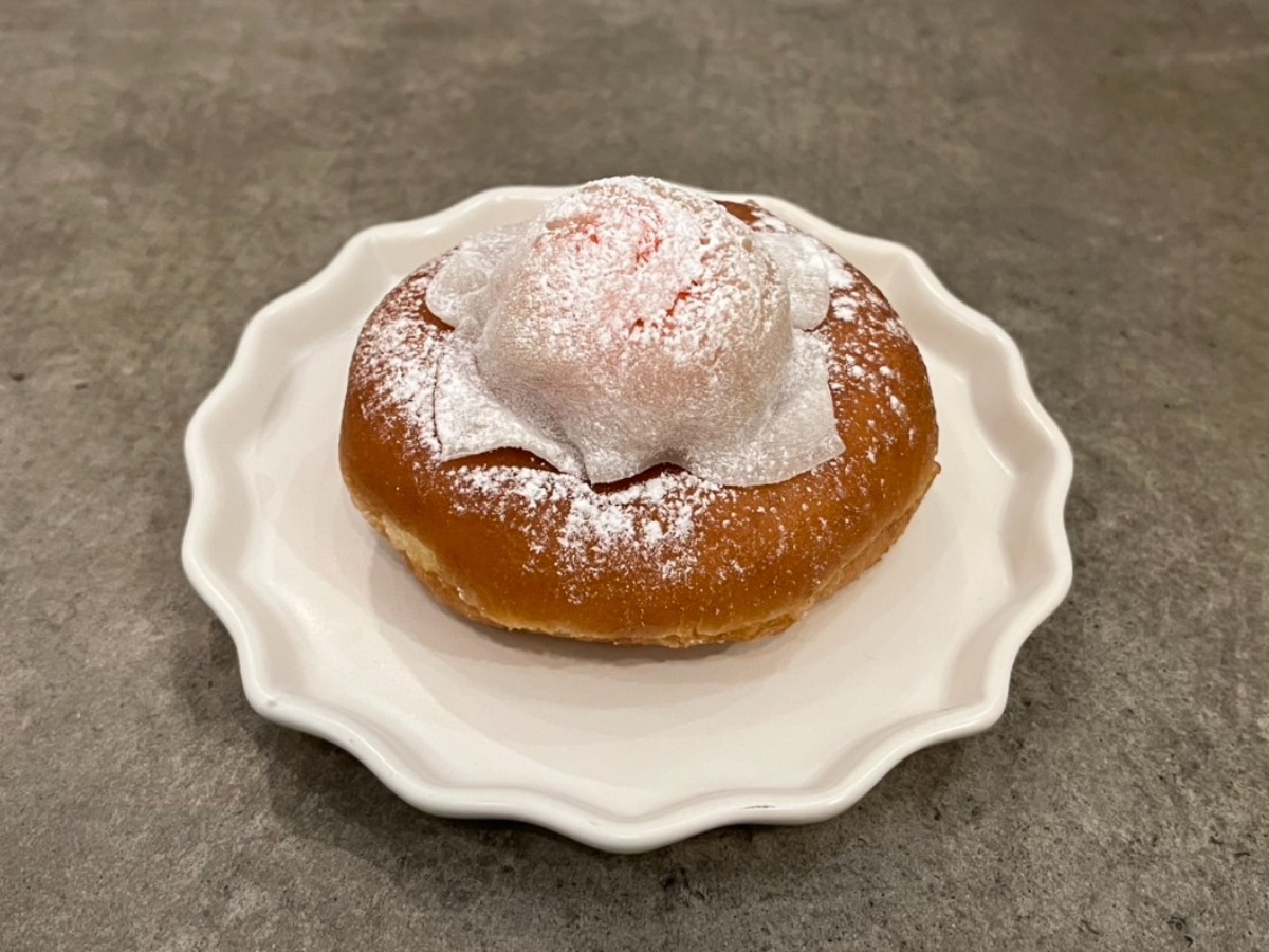 「TOU°C」では、お菓子屋ならではの高級生クリームやカスタードを使用した、贅沢なドーナツが味わえます。その中でも特に注目なのが、「イチゴ大福入りドーナツ」。