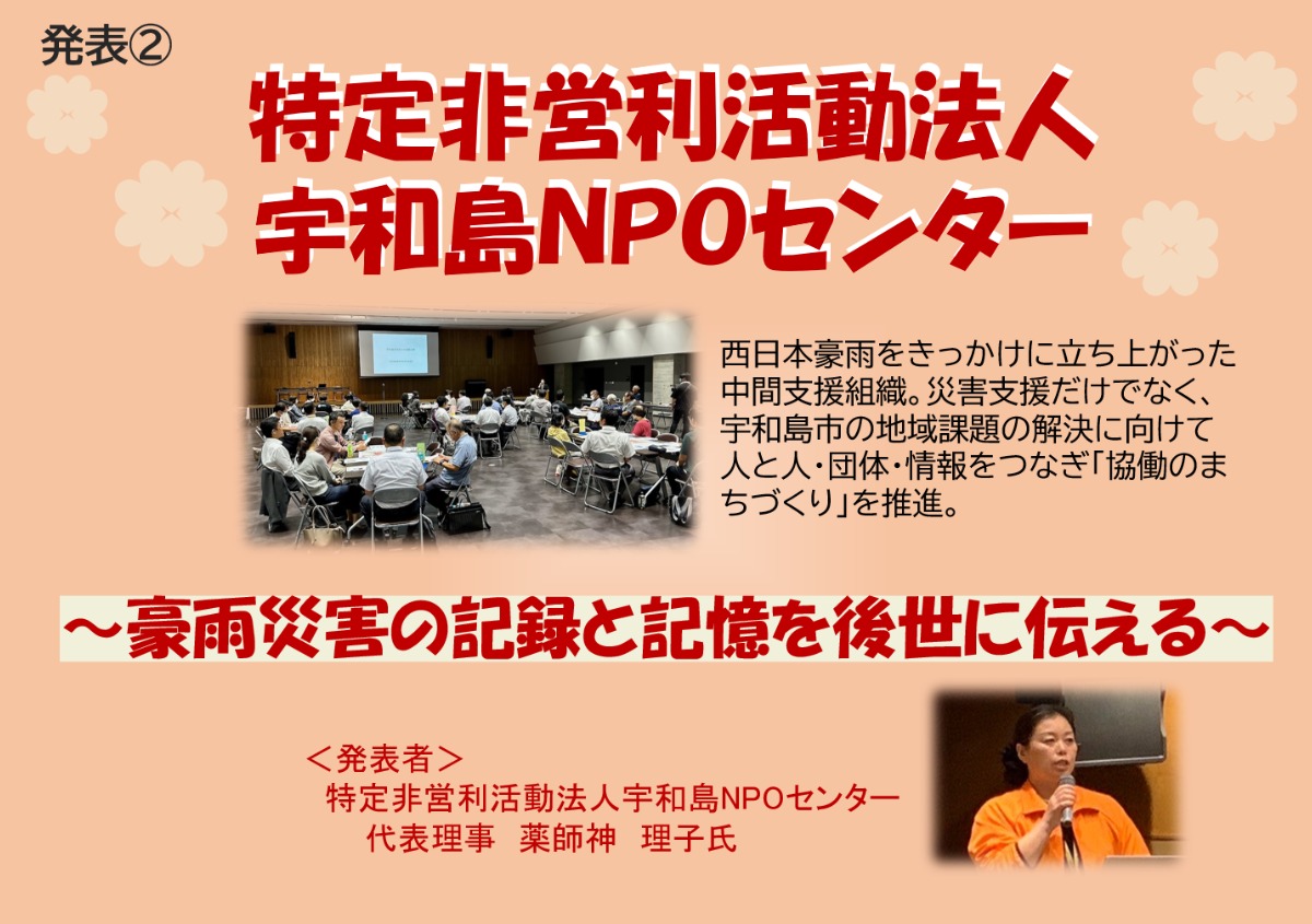 第2部では、「あったか愛媛NPO応援基金」の助成事業を活用して地域課題の解決に取り組んだNPO法人2団体の活動報告を行いました。