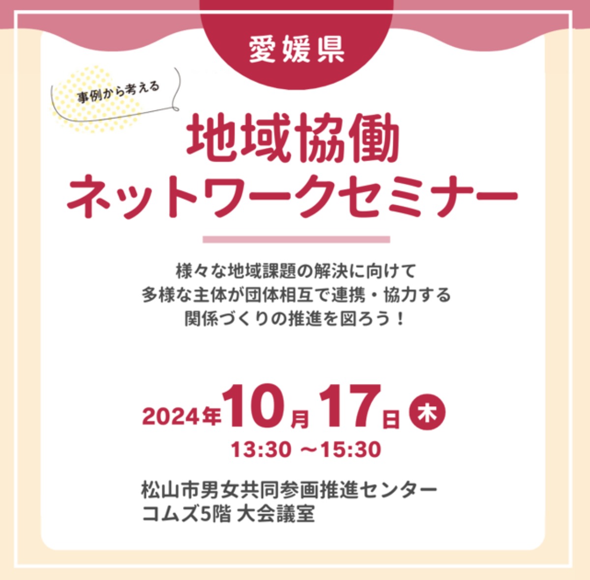 愛媛県が、様々な地域課題の解決に向けて、多様な主体が団体相互で連携・協力する関係づくりの推進を図るセミナーを開催しました。