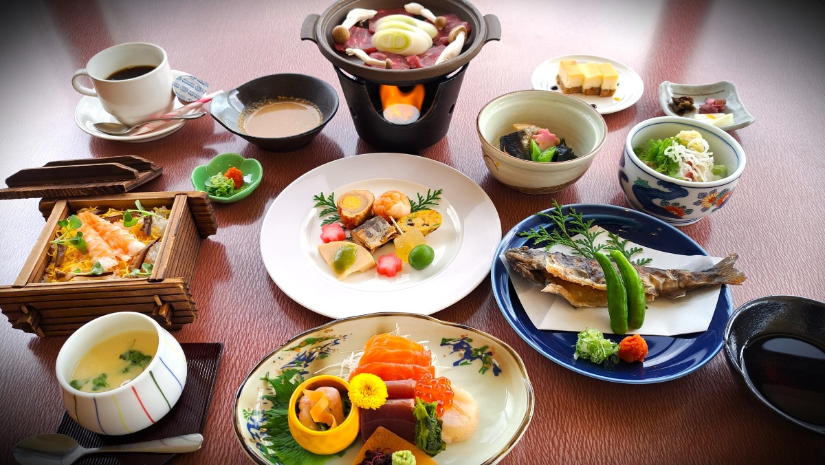 山々の美しい景色を眺めながら、愛媛の旬の食材を料理長の匠の技で彩った会席料理を堪能できます。