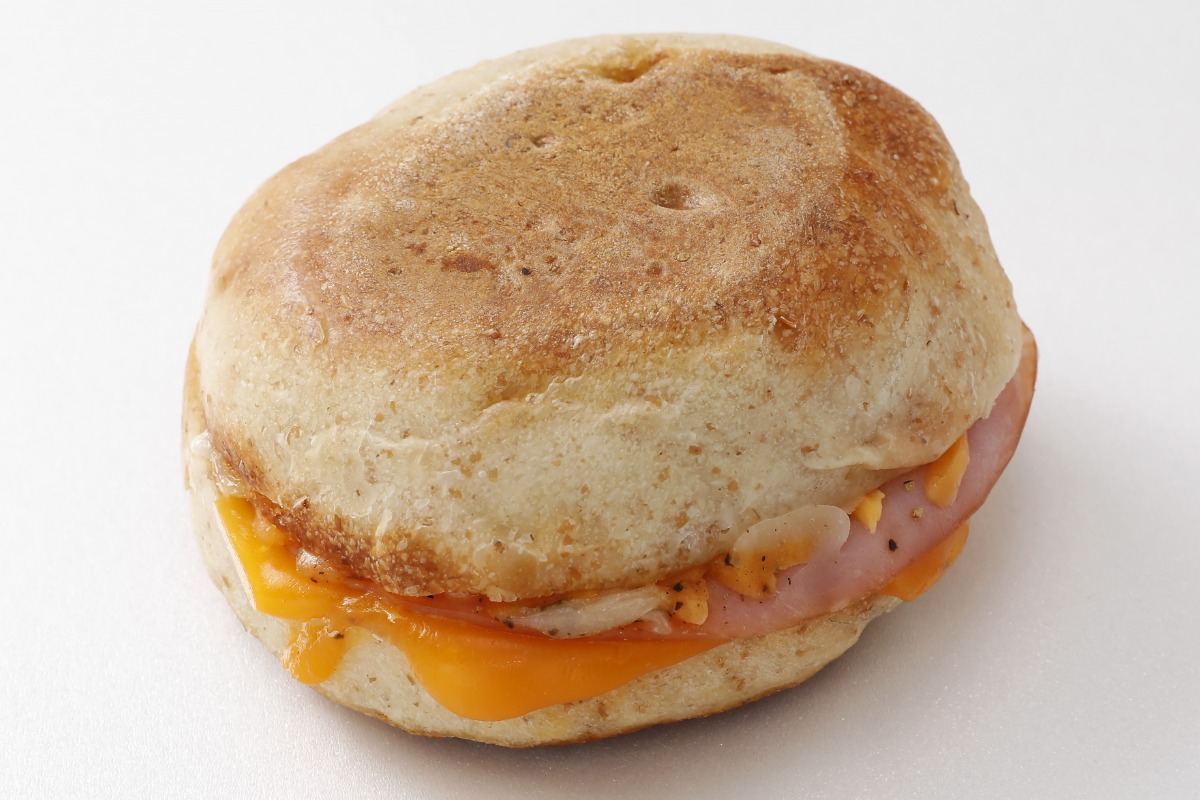 イングリッシュマフィンに チェダーチーズとハムをはさん で、プレスして焼き上げています。
