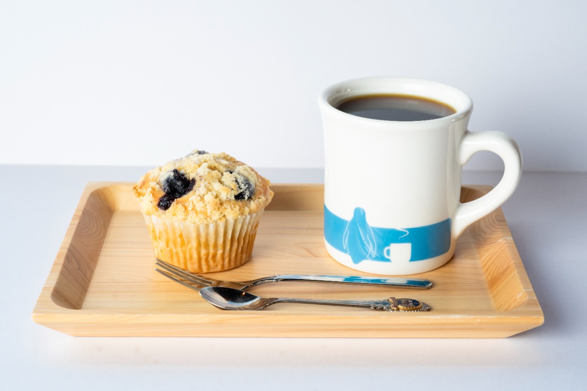 ブルーベリーとクランブルの自家製マフィンと、好きなドリンクが選べるセット。おすすめは自家焙煎コーヒー!