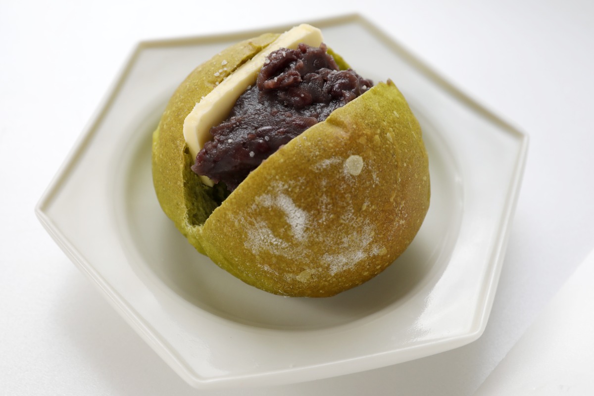抹茶が香るパンに、きび砂糖で 煮た、やさしい甘さの自家製あん ことバターをサンド!