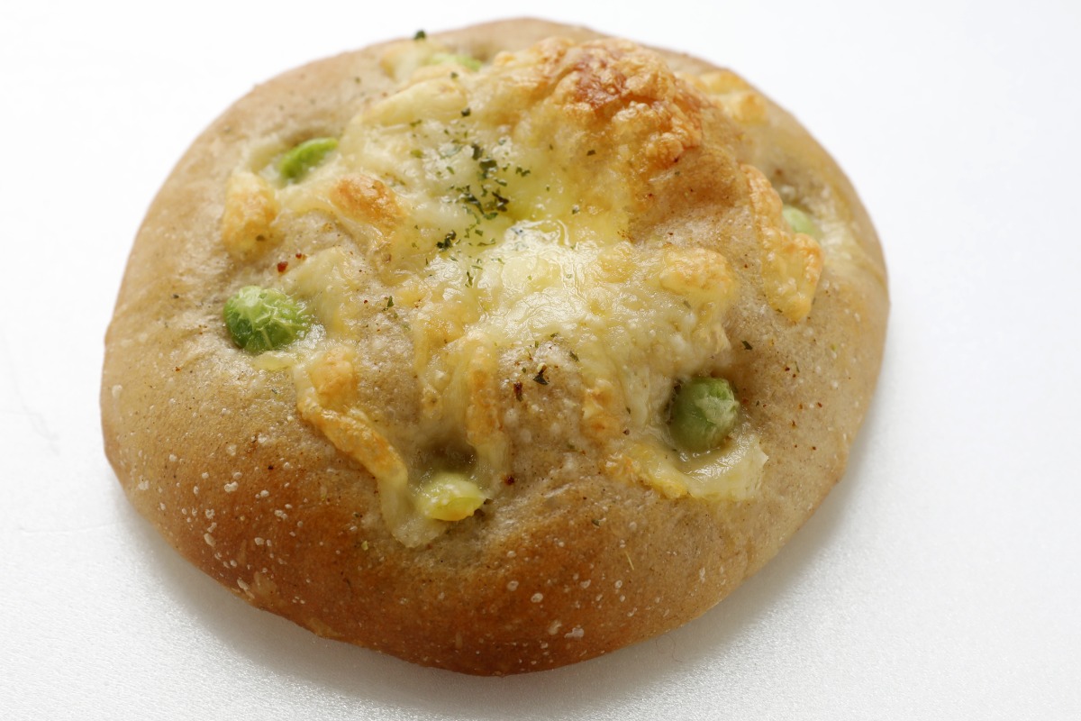 玄米が香ばしいもっちりとした生地の上 に枝豆とチーズ、そしてオリーブオイルを 塗って焼いたパン。卵・乳製品不使用です。