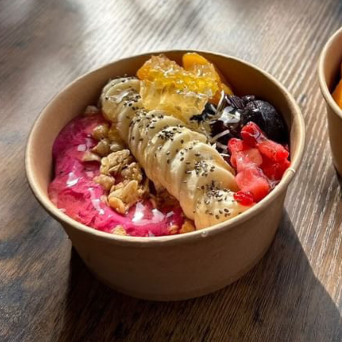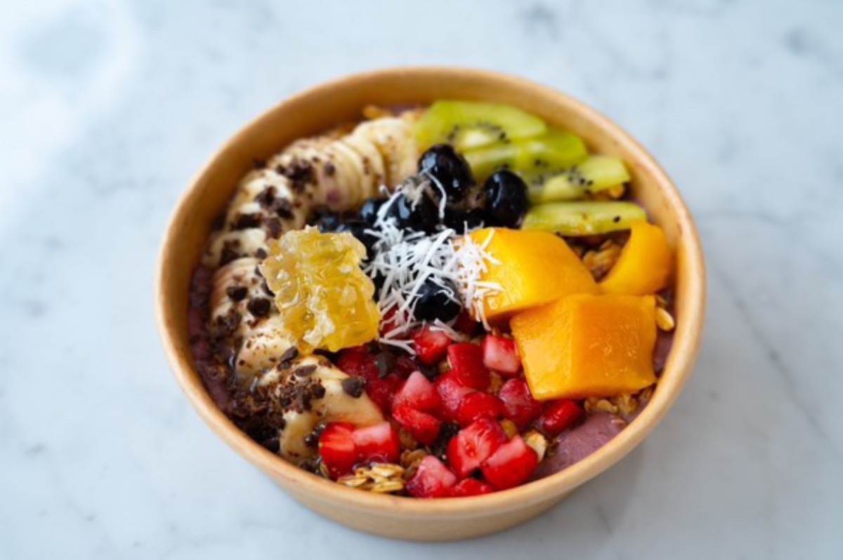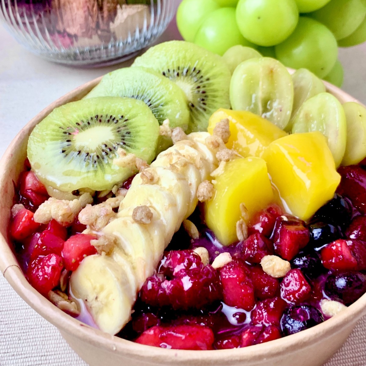 人気の「アサイーボウル」は、ブラジル原産のスーパーフード「アサイー」に、マンゴー・いちご・バナナ・グラノーラ・キウイ・ココナッツなど、フルーツをたっぷり乗せています。