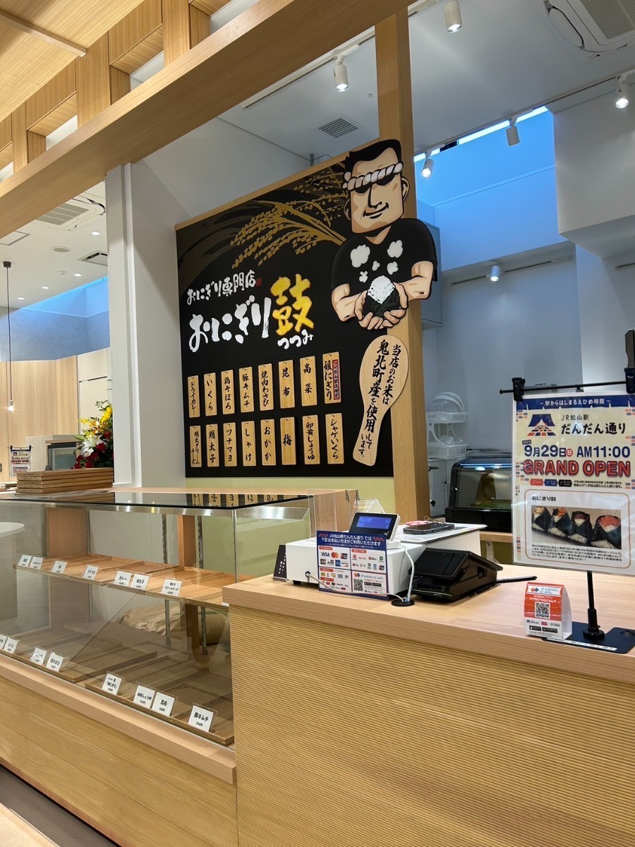 JR松山駅のリニューアルとともに2024年9月オープンした「おにぎり鼓」2号店は、ガス窯で炊いたごはん2回だけ握ったふんわりおにぎりが自慢です。