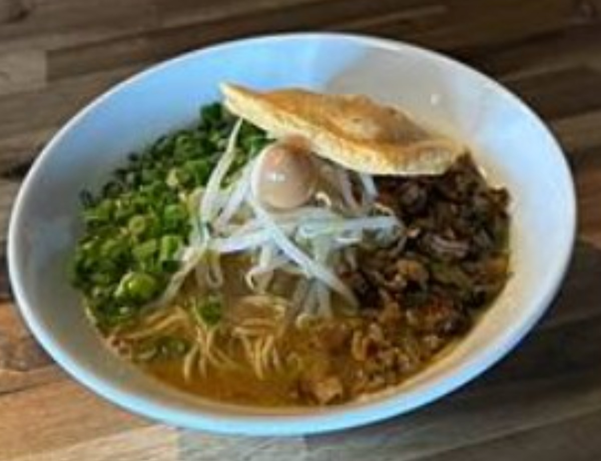 「ホタテみそラーメン+チーズせんべいトッピング」(1,100円)は、味も食感も楽しめる特別な一品です。ホタテの旨みがしっかりと効いた濃厚な味噌スープは、深みのある味わいで心も体も温まります。さらに、トッピングのチーズせんべいがユニークなアクセントに。パリッとした食感とチーズの香ばしさが加わり、スープと一緒に味わうことで一層リッチな風味に仕上がります。