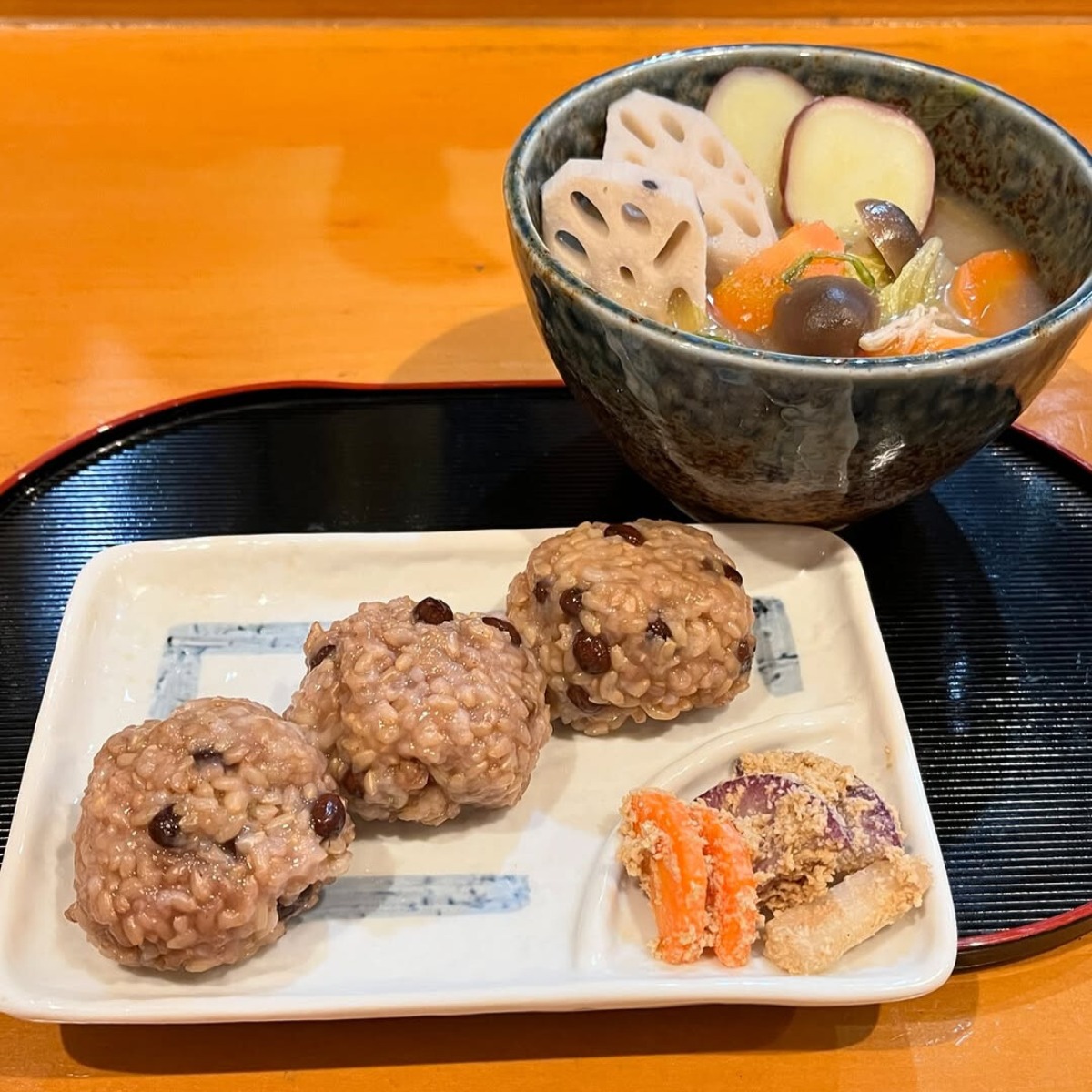 酵素玄米おにぎり(2~5個)、食べる味噌汁、ぬか漬けが付いた、具だくさんの味噌汁がメインのランチです。