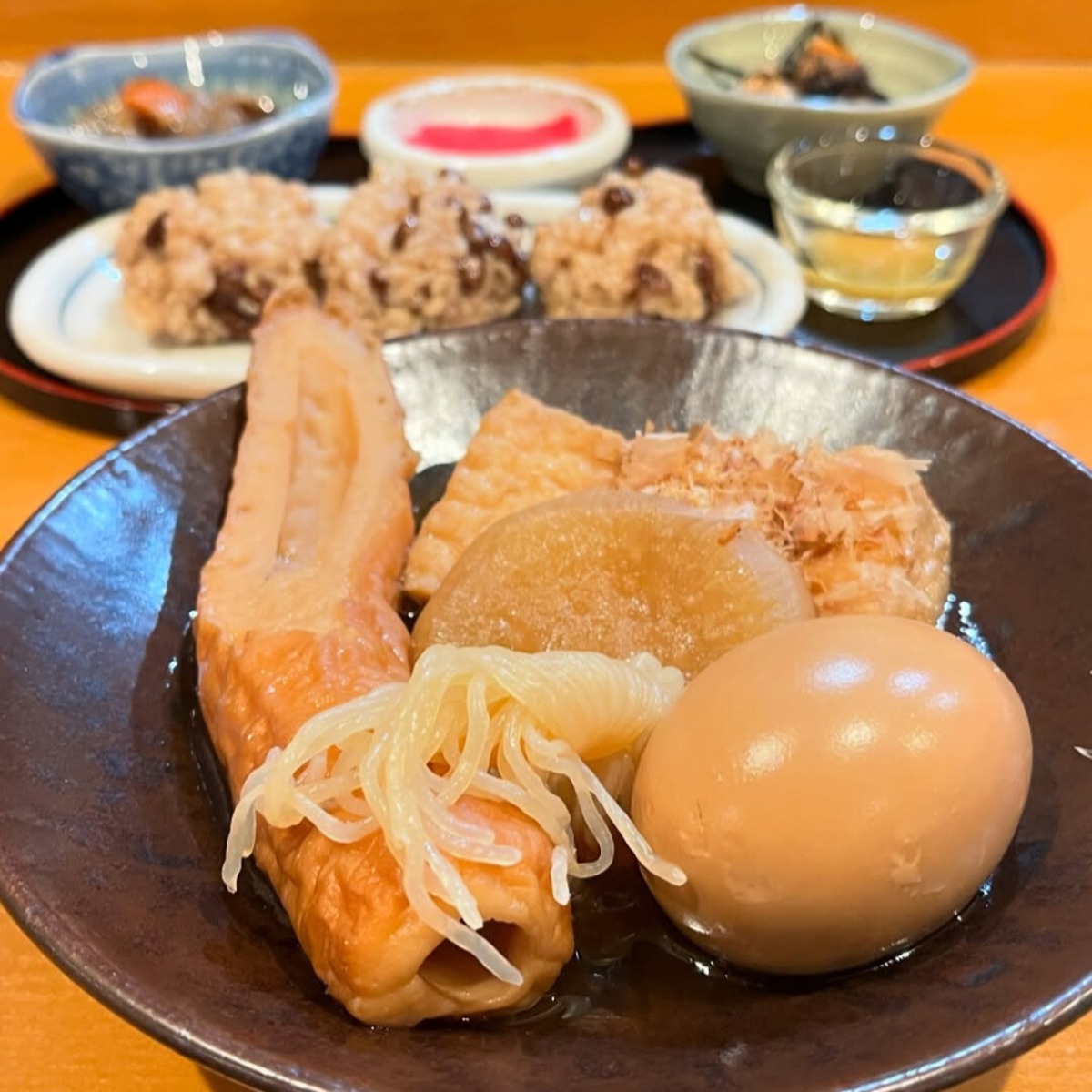 塩麹おでん、酵素玄米おにぎり3個、小鉢、ぬか漬けが付いたメニュー。
