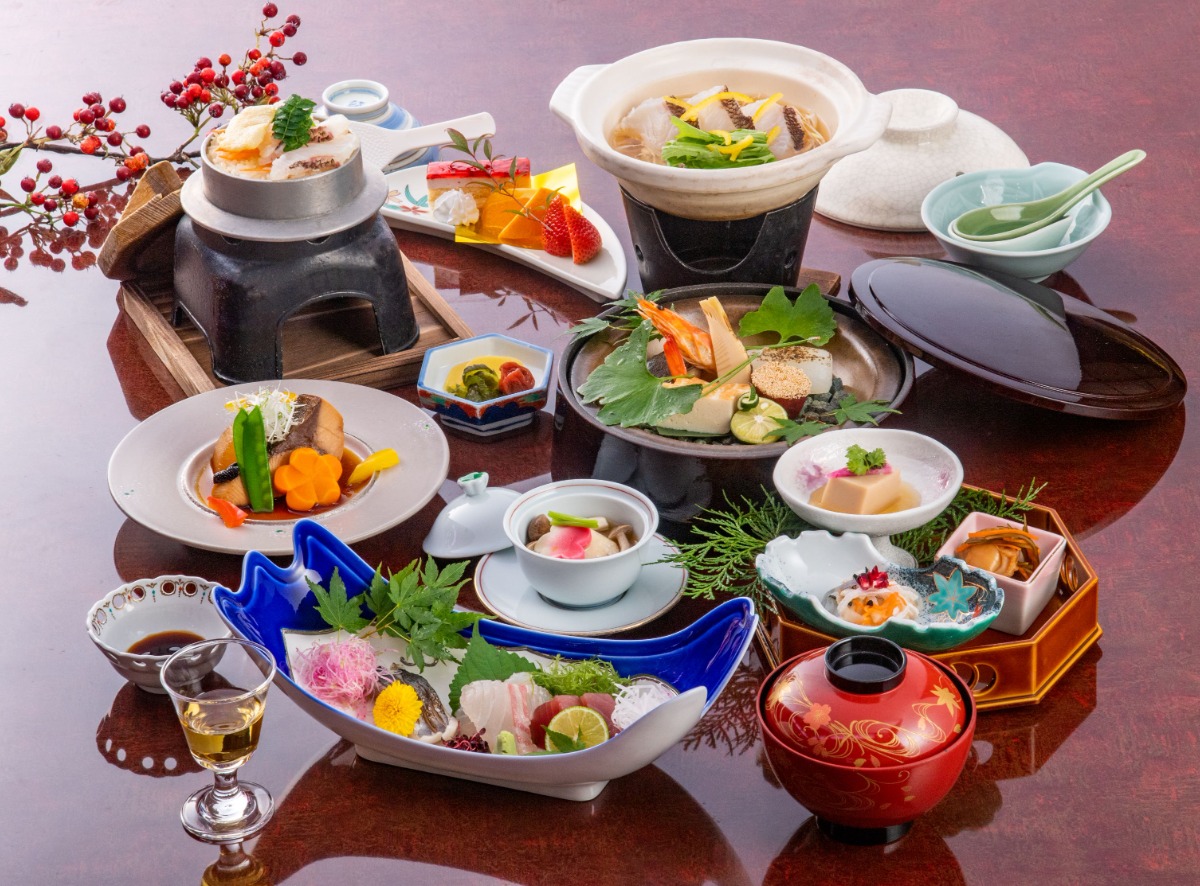 夕食は旬の素材を生かした彩り豊かな豪華会席を堪能することができます。会場は、会議・式典・研修会・講演会などにも利用可能です。