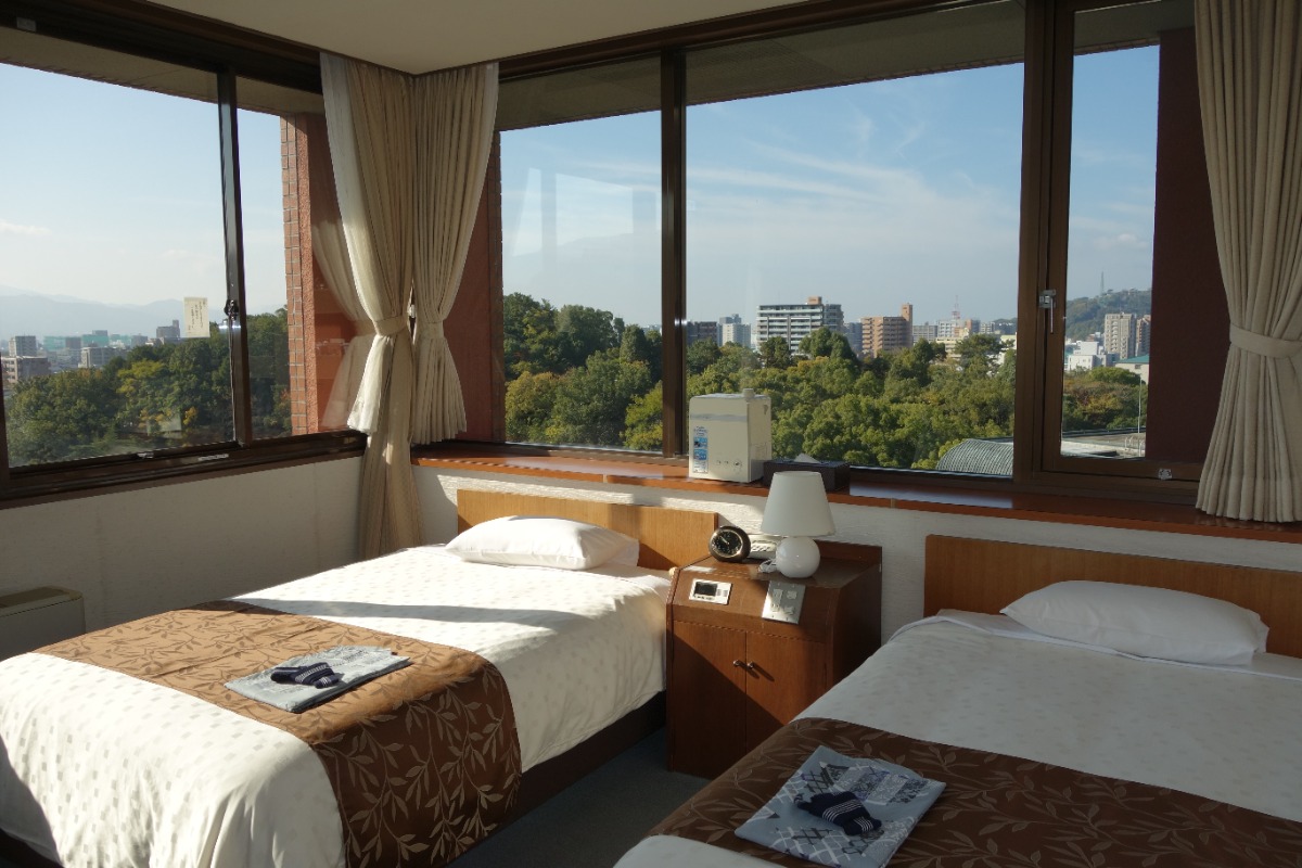 ソファーベッドでくつろげるシングルの部屋や松山城を遠くに望む2面採光のコーナーツインの部屋、車椅子対応のバリアフリーのツインルームなどが用意されています。