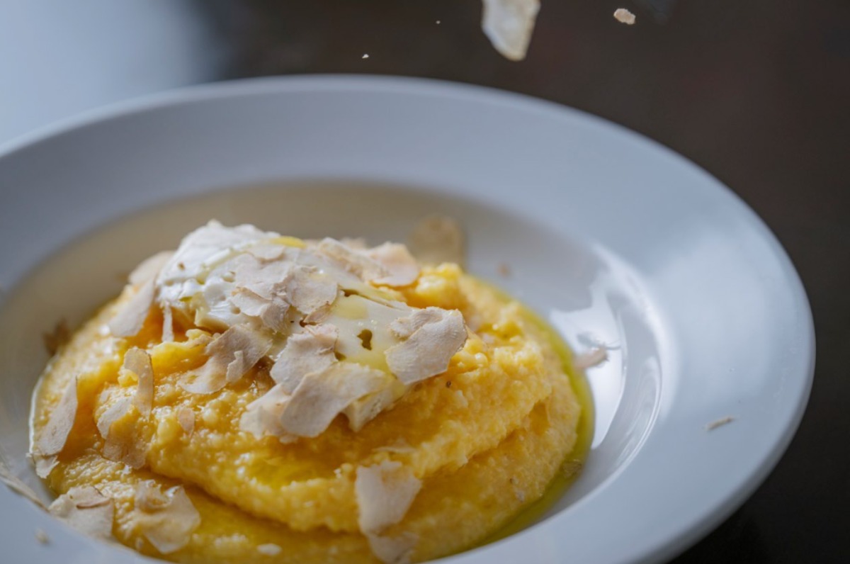 「ポレンタ」に、トーマ・ピエモンテーゼ(チーズ)と白トリュフをのせた食感と香りが楽しい一品。