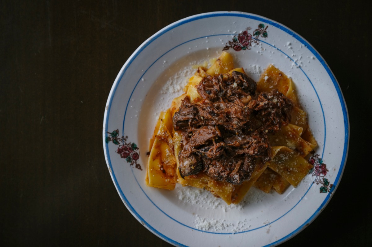 しまなみで獲れたイノシシを柔らかく煮込んだラグーソース。パッパルデッレという幅広のパスタで満足感も抜群。1920年代の「リチャードジノリ」の皿が彩りを添える。