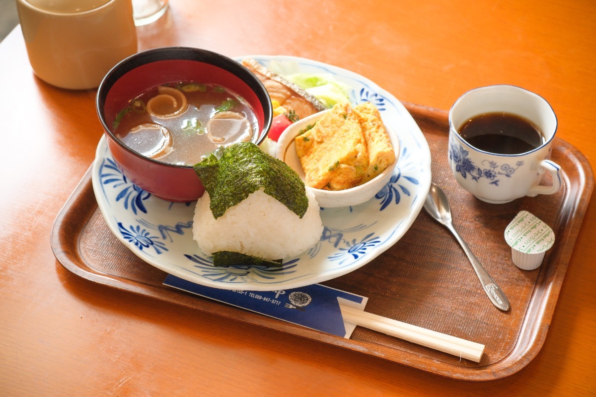 写真の「おにぎりモーニング」は、大きめのおにぎりにおかずや味噌汁がセットになっていてボリューム満点!
