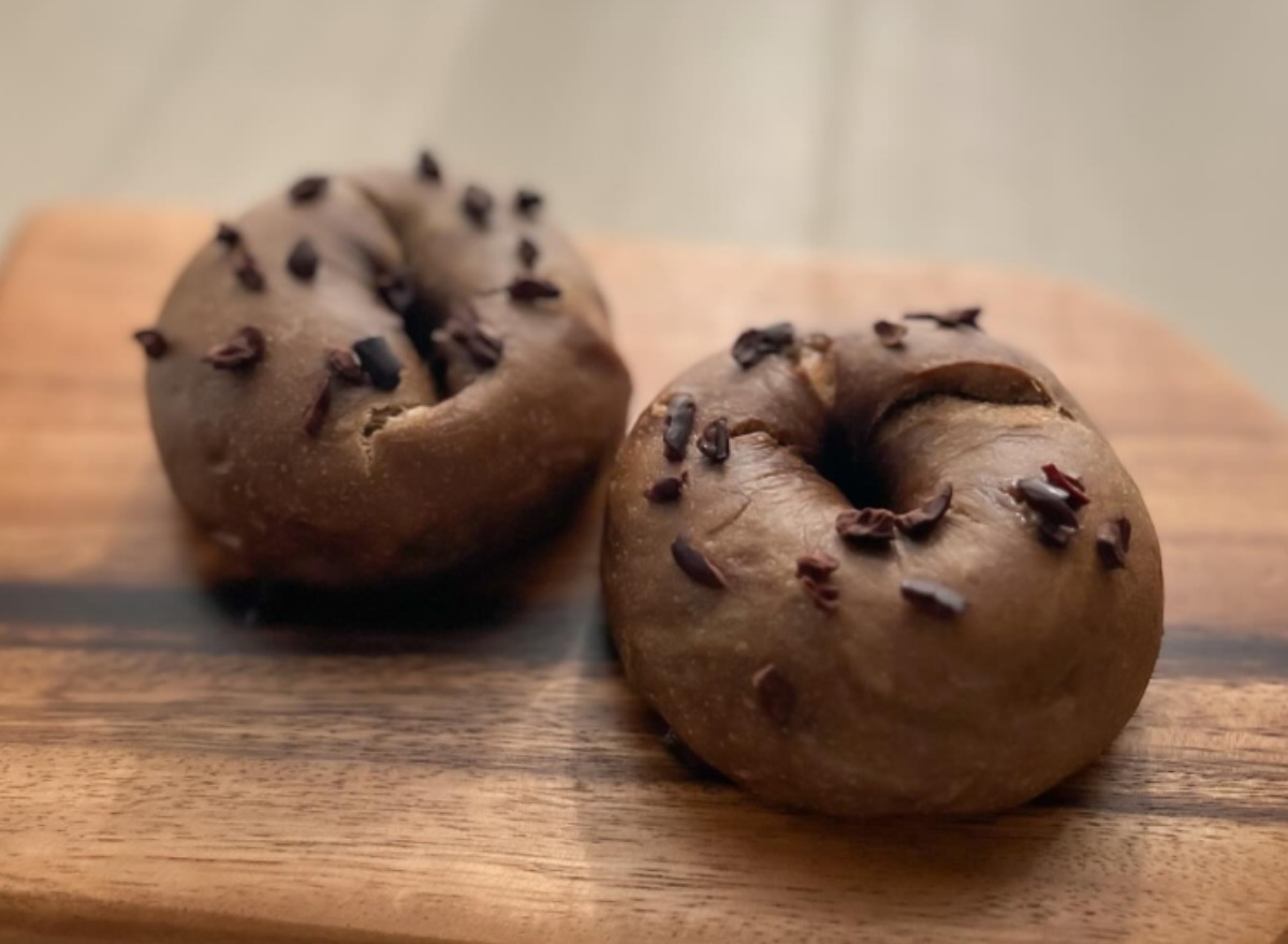 キャラメルラテベーグルは、コーヒー生地にキャラメルチョコレートを入れ、カカオニブをトッピング。