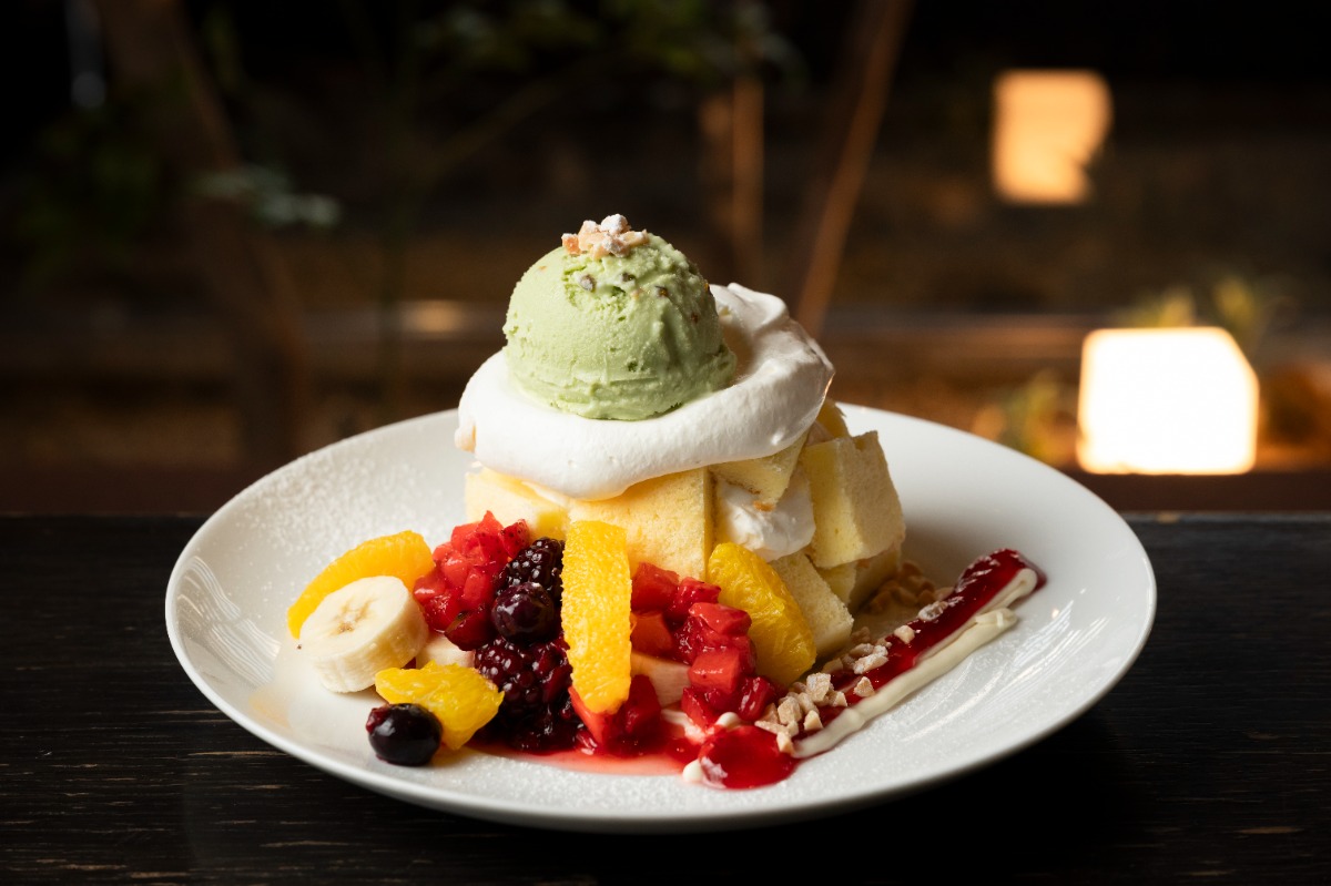 ローストピスタチオのアイスとミックスベリーやオレンジ、バナナを盛りつけた色鮮やかな贅沢パフェです。