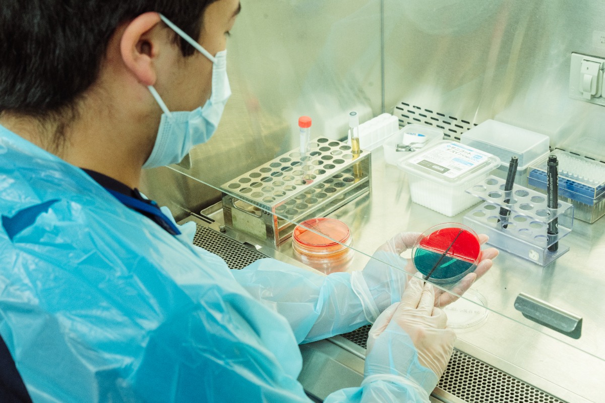 安全キャビネットで培養検査をする臨床検査技師(細菌検査室)