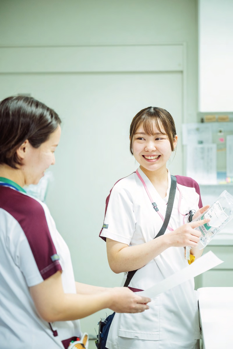 先輩に確認しながら業務を進める和田さん。積極的に学びながら経験を重ね、患者一人ひとりの状態に応じたケアのための確実な技術の習得を目指す。手術後の患者のケアや点滴の準備など一つひとつ着実に成長を遂げている。