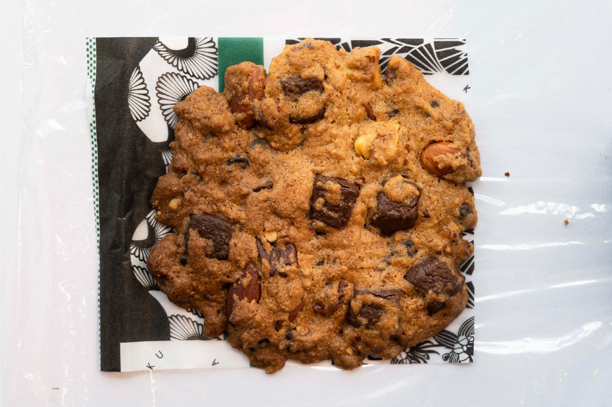 2種のチョコと3種のナッツを使った、ザクザク食感がやみつきの「ライ麦クッキー(410円)」も一緒に。
