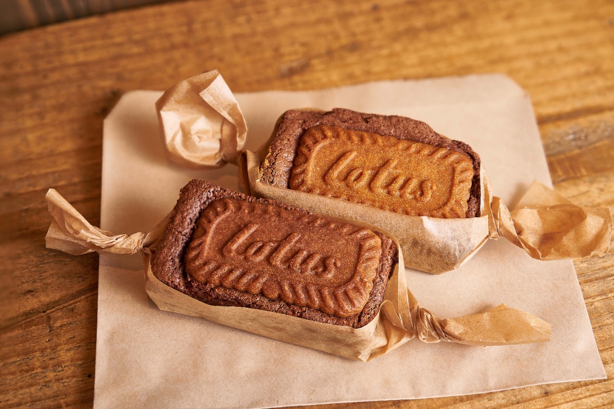 濃厚なチョコブラウニーとサクサクのクッキーのアクセントが楽しめる「ロータスブラウニー(350円)」も味わってみて。