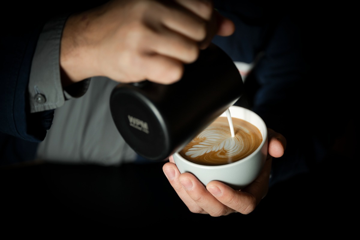 ミルクの注ぎ方で描いた模様の可愛さに心奪われるラテ。ぜひできたてを味わって。