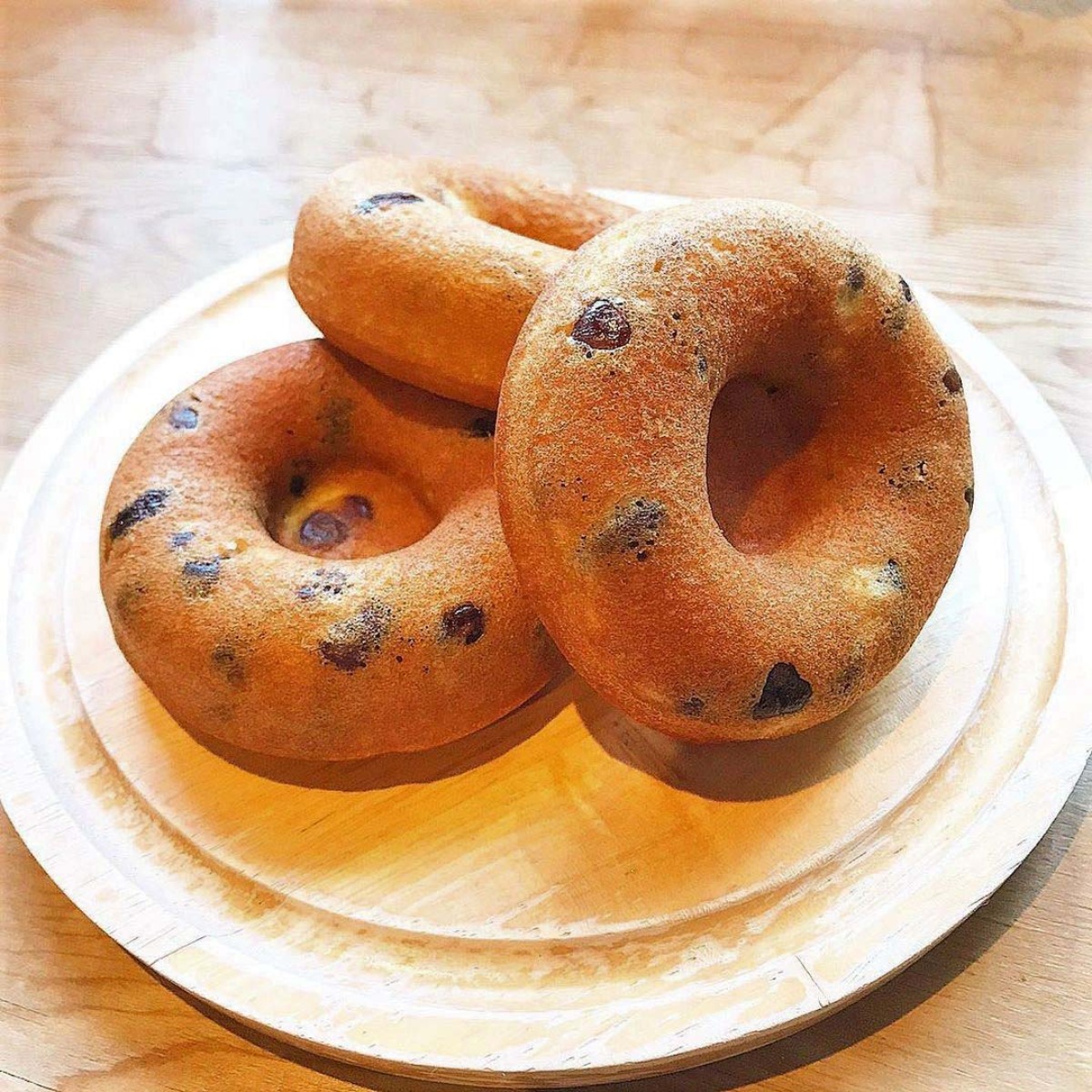 「焼きドーナツ(チョコチップ1個200円)」。ヘルシーで優しい甘さの焼きドーナツ。冷めても美味しくリベイクしても◎。