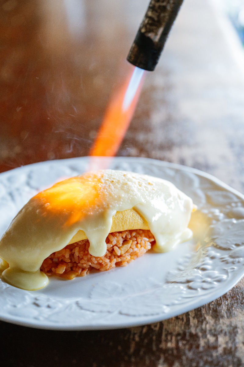 今回、取材させていただいた「チーズオムライス +ラクレットチーズ」は、とろ~りとろけるチーズをかけた後に、バーナーで軽く炙ってトマトソースかオリジナルソースをかけて完成します。