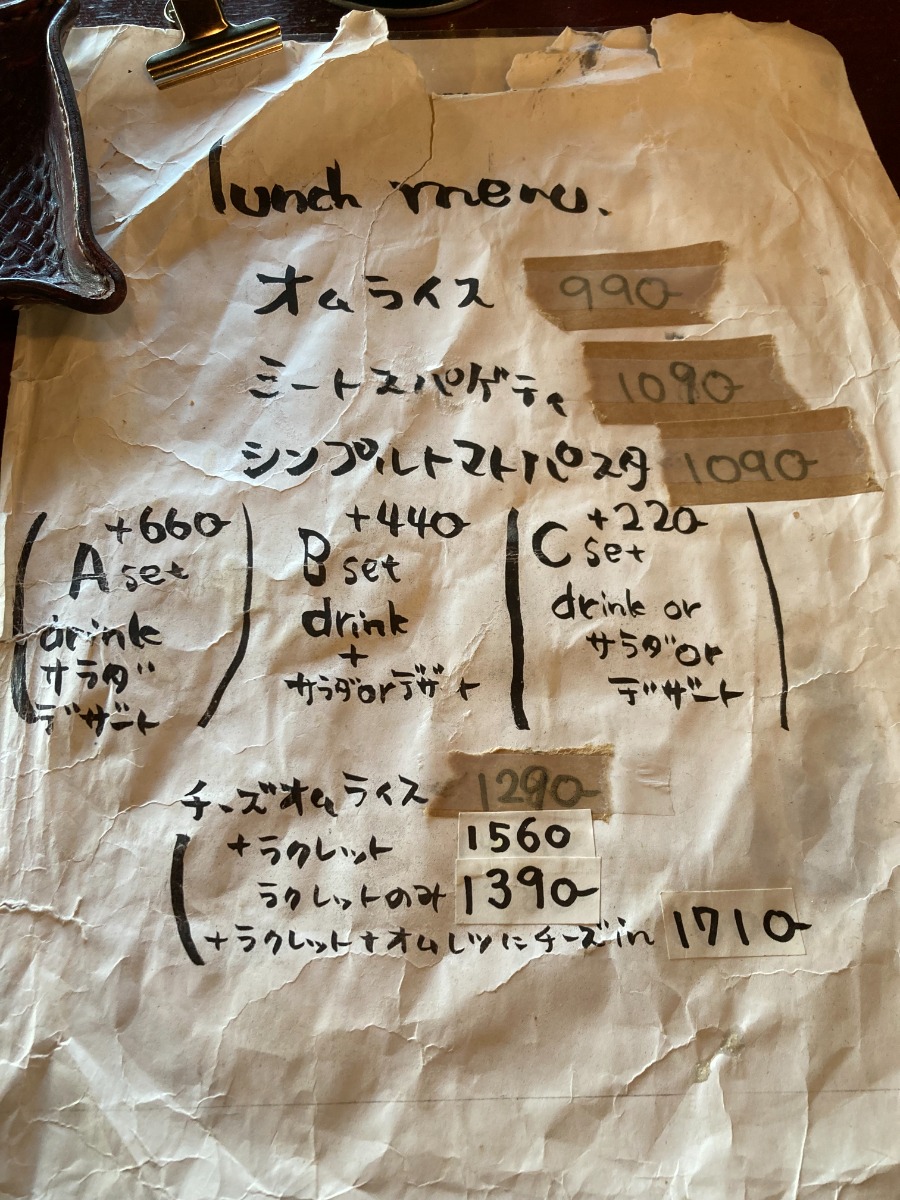 ランチタイムはオムライスの他にも、人気の「ミートスパゲティ」「シンプルトマトパスタ」の注文も可能です。ドリンクやデザートをつけることができるセットメニューもあります。
