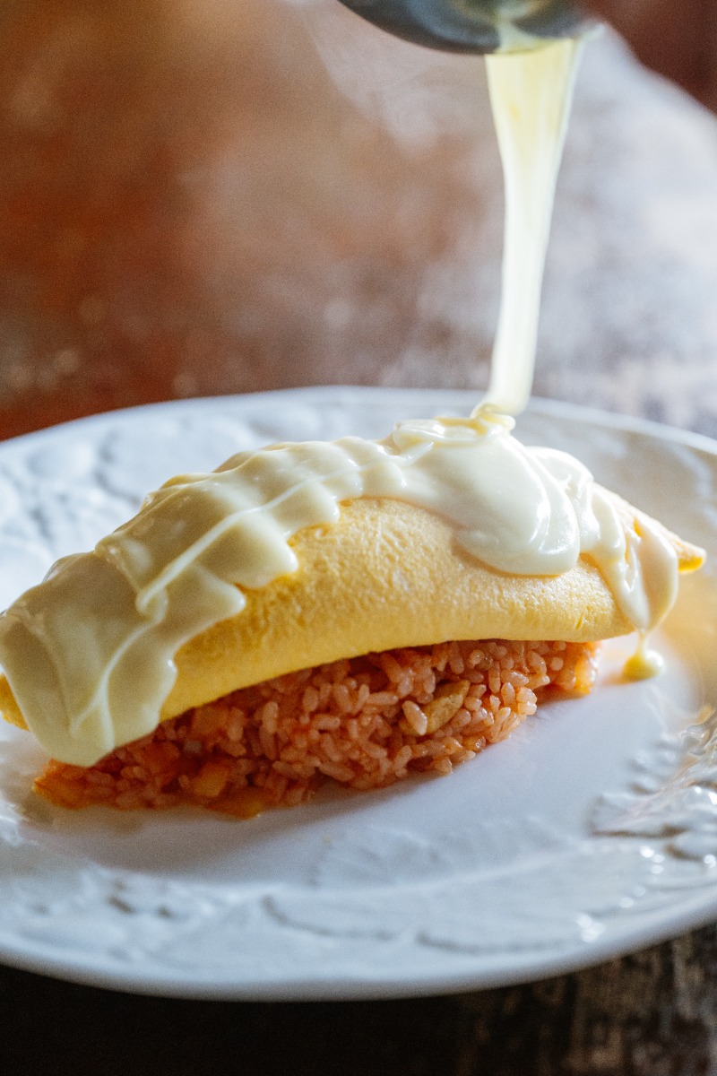 自分好みにカスタマイズすることができ、ベーシックなオムライスはもちろん、店主のチーズ愛から生まれた「チーズオムライス」が特に人気です。「チーズオムライス」は、ゴーダ、モッツァレラ、北海道産チーズの3種類を混ぜ合わせ、仕上げにたっぷりとかけます。