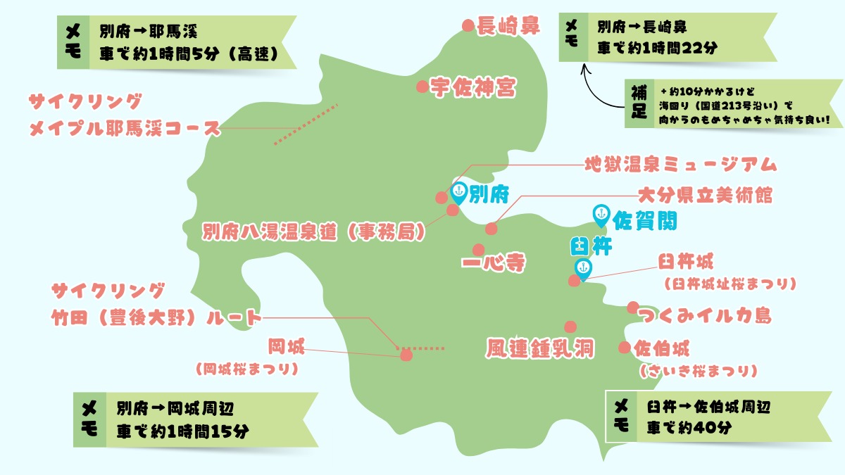 別府市から車で1時間余りあれば各地域にたどり着けるのが大分県の魅力の一つでもあります。