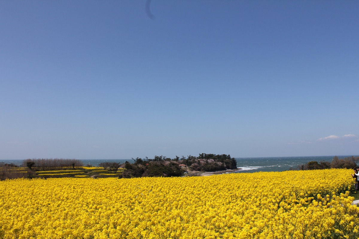 海風を感じて、目の前には一面の菜の花と海。甘い菜の花の香りを身にまとい、美味しいグルメに舌鼓を打つ。