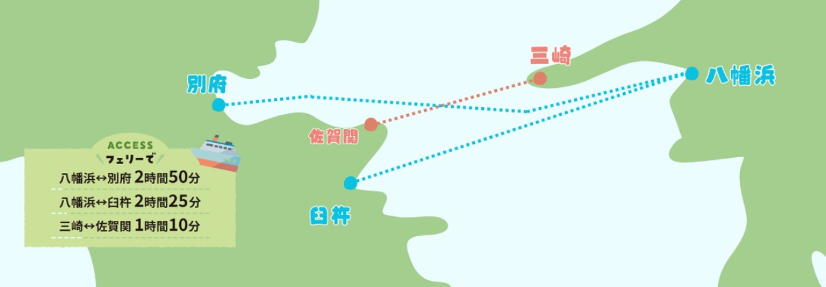 八幡浜からフェリーで2~3時間、三崎からは1時間と少しで到着します。